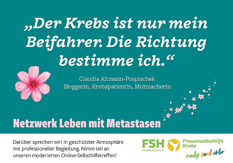 Frauen mit einer metastasierten Krebserkrankung haben besonderen Unterstützungsbedarf. Das zeigen unsere langjährigen Erfahrungen in der Frauenselbsthilfe Krebs. In unserem Netzwerk „Leben mit Metastasen“ findet Ihr ein Angebot, das speziell auf Eure Bedürfnisse zugeschnitten ist. Mit den moderierten Online-Selbsthilfetreffen haben wir Kontakt und Vernetzungsmöglichkeiten geschaffen. Außerdem gibt es weitere Angebote, die besonders auf die Verbesserung der Lebensqualität in der chronischen Erkrankungssituation ausgerichtet sind.
